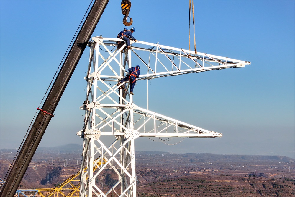 1月1日,國網(wǎng)山西送變電公司施工人員堅(jiān)守施工現(xiàn)場,在500千伏忻州北-陽泉線路工程開展落地雙搖臂抱桿組塔作業(yè)。