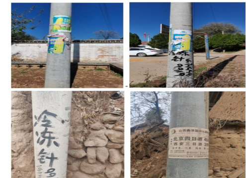 2023年,國網(wǎng)沁縣供電公司(以下簡稱“沁縣公司”)探索出利用廢舊電桿為鳥筑巢的方法,壓降在運線路跳閘率30%。這一實踐為自有電力設(shè)備資源的高效利用探索出新路徑?;诖耍?024年沁縣公司進一步探索農(nóng)村在運電桿潛在價值釋放。經(jīng)調(diào)研,沁縣全域533個自然村,平均每個自然村有40基電桿,大約21320基電桿。60%電桿的桿體存在被亂涂亂畫、張貼小廣告等影響鄉(xiāng)村美觀的問題(如圖1),與鄉(xiāng)村振興的時代課題不相適應(yīng);5%緊貼路邊的電桿容易受外力撞擊,造成桿體破損,形成安全隱患;95%以上電桿桿體缺乏管理,電桿下端位置未被有效利用。