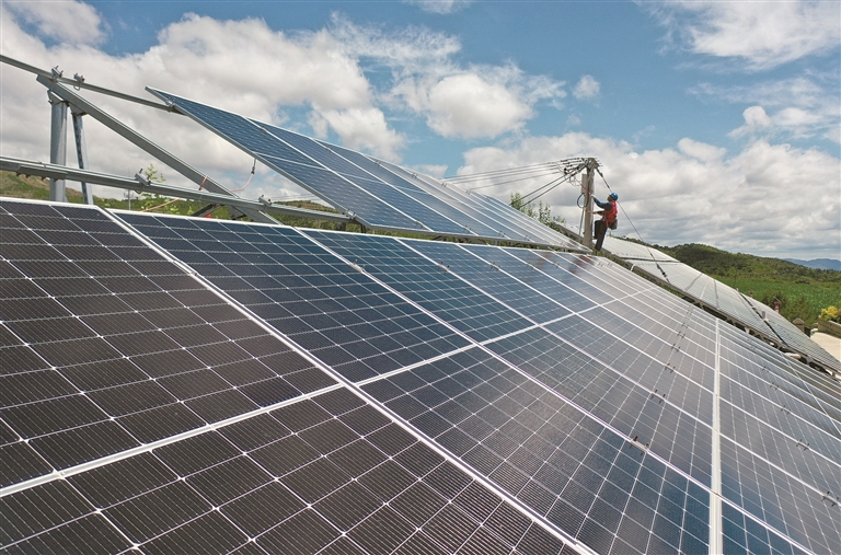 國網(wǎng)天鎮(zhèn)縣供電公司太行黎明共產(chǎn)黨員服務(wù)隊隊員在谷前堡鎮(zhèn)白羊口村對分布式屋頂光伏進(jìn)行隱患排查。
